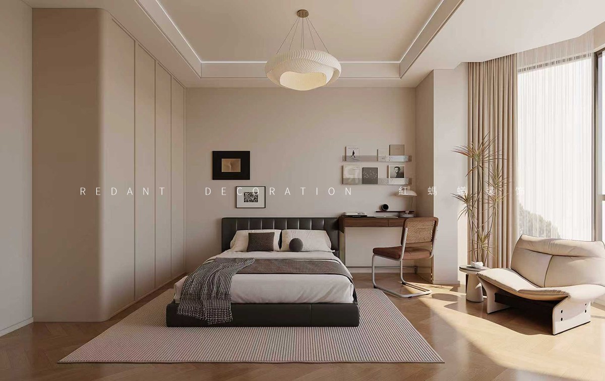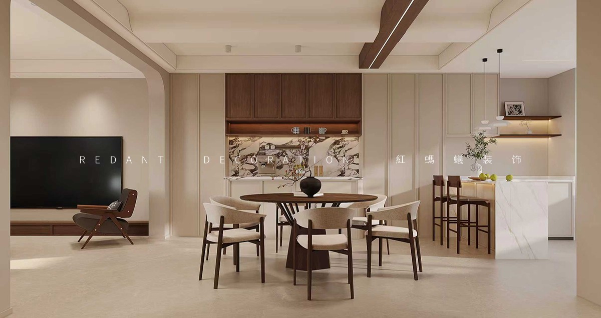本方案以复古奶油风融合中古风为核心,以奶咖、橄榄绿与胡桃木色为基调,搭配实木、皮革、棉麻材质及弧形线条、复古灯具,打造优雅松弛的高端居住空间。公共区开放式布局,橄榄绿弧形沙发为焦点,配胡桃木茶几、复古单椅,弧形吊顶柔化边界,开放书架与绿植添生机;主卧延续低饱和色调,奶咖墙配胡桃木家具,复古绿休闲椅与绿植呼应,嵌入式开放格加罗马柱细节,以流畅动线、细腻材质、精准色彩,满足社交生活与精神松弛需求。