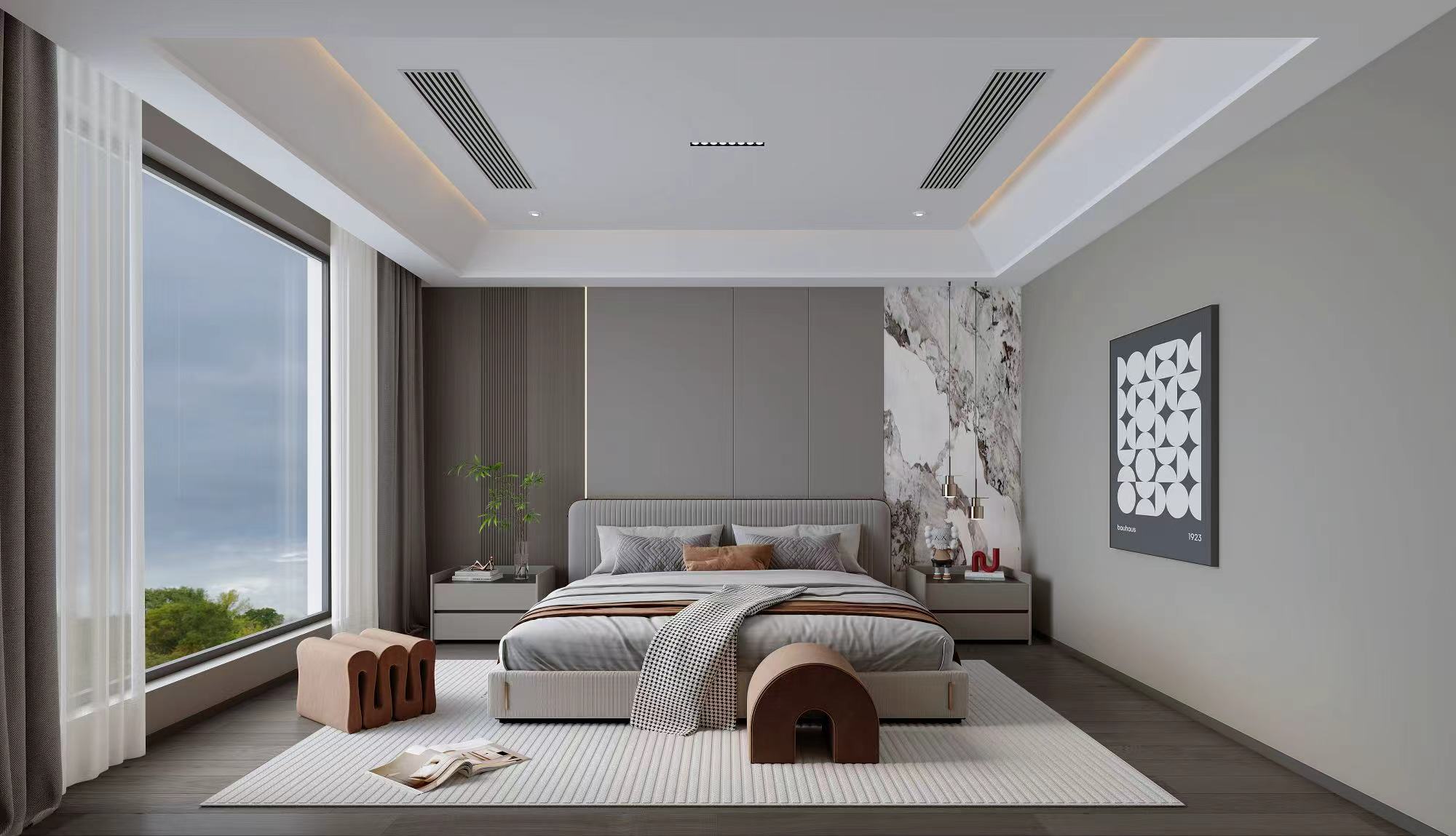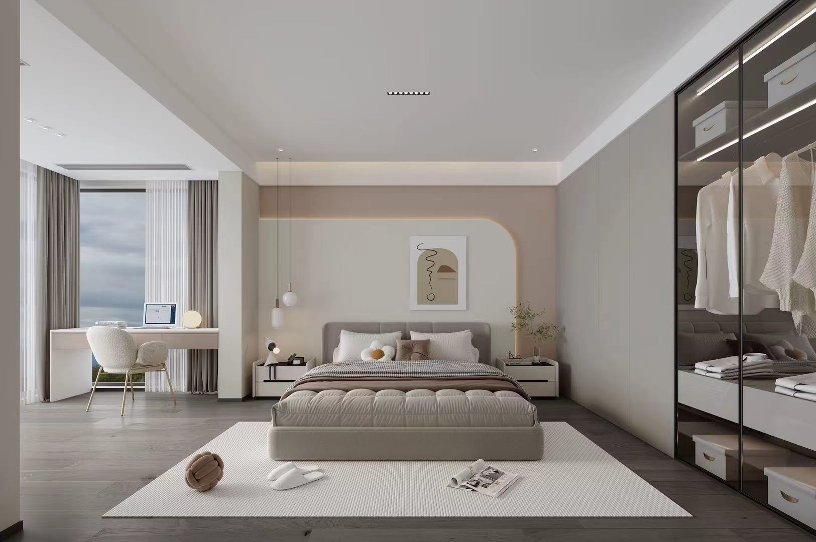 二、三层聚焦全龄居住,主卧、长辈房、儿童房及次卧各有风格,兼顾舒适、私密与实用。动线规划流畅,全景落地窗、挑空设计与无主灯系统,优化采光通风,强化空间层次与艺术氛围。