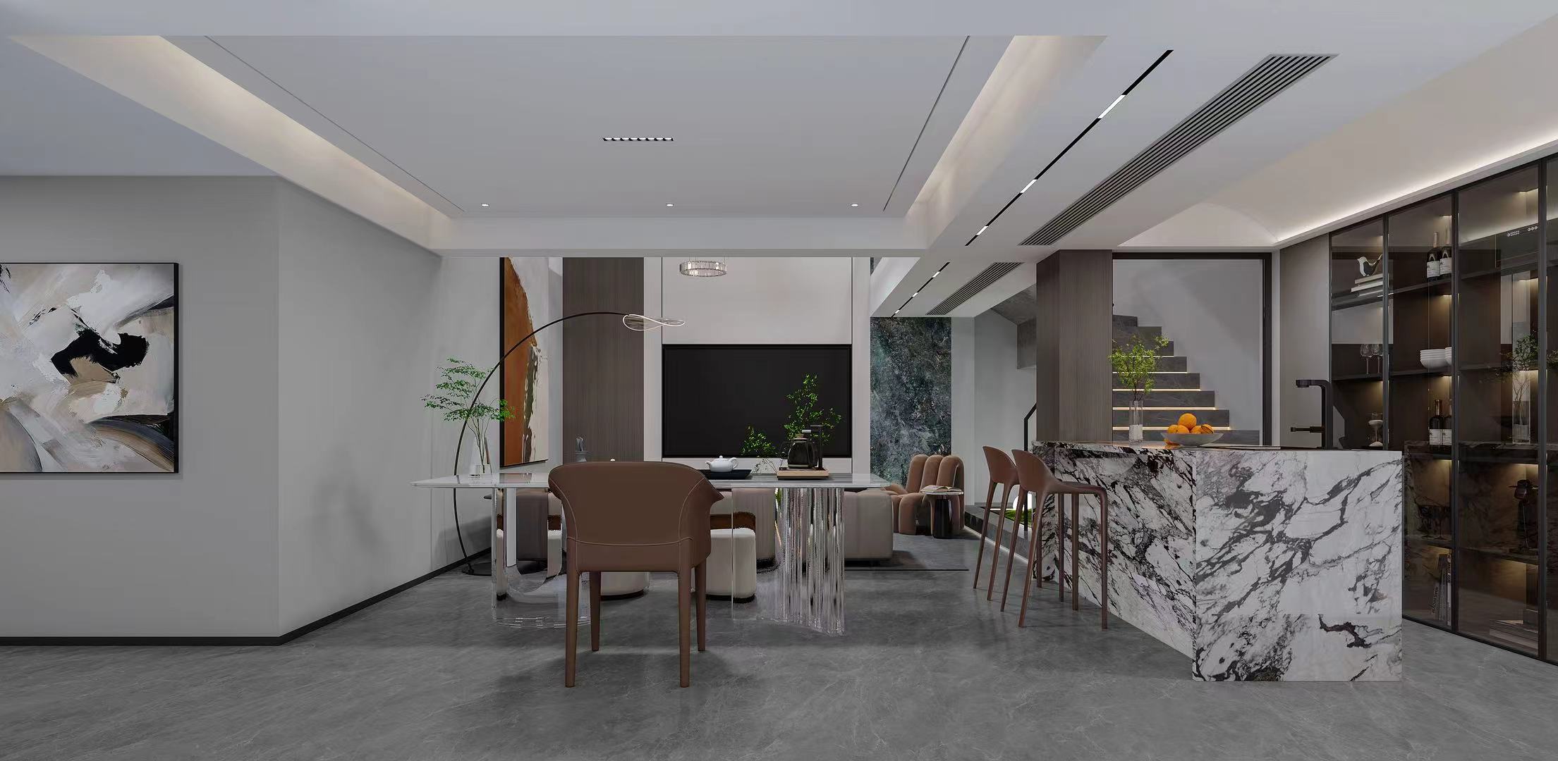 负二层设专属停车区与休闲会客区,负一层规划轻社交与辅助生活区,嵌入电梯提升通行效率。一层以挑空客厅为核心,中西厨、餐厅与客厅开放式联动,适配家庭聚会、宴请等多元需求。