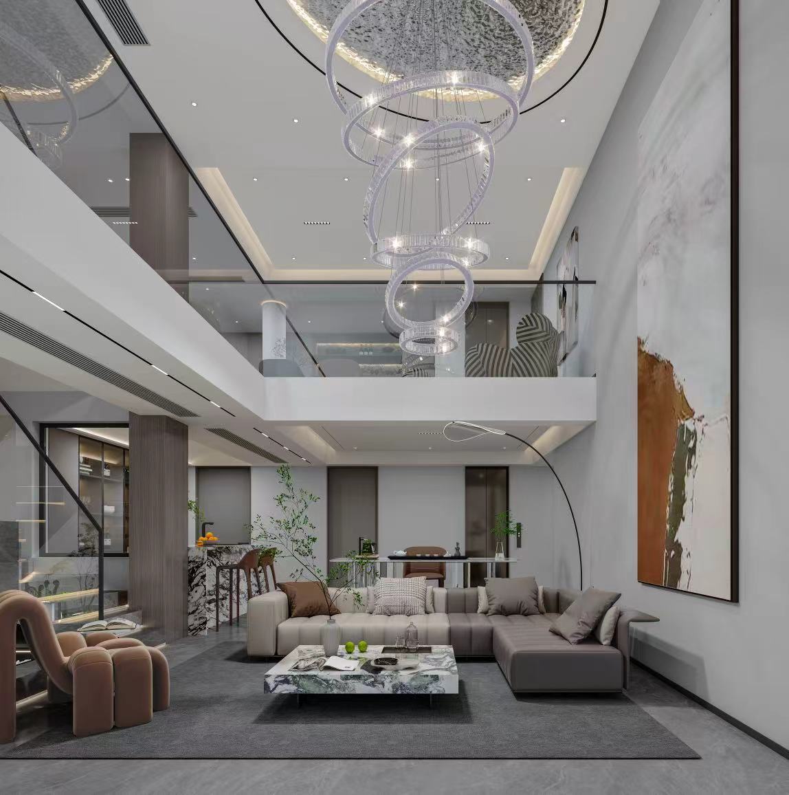 本多层户型巧借挑空与纵向空间,融合现代极简与轻奢风格,打造全龄适配的高品质居住空间。