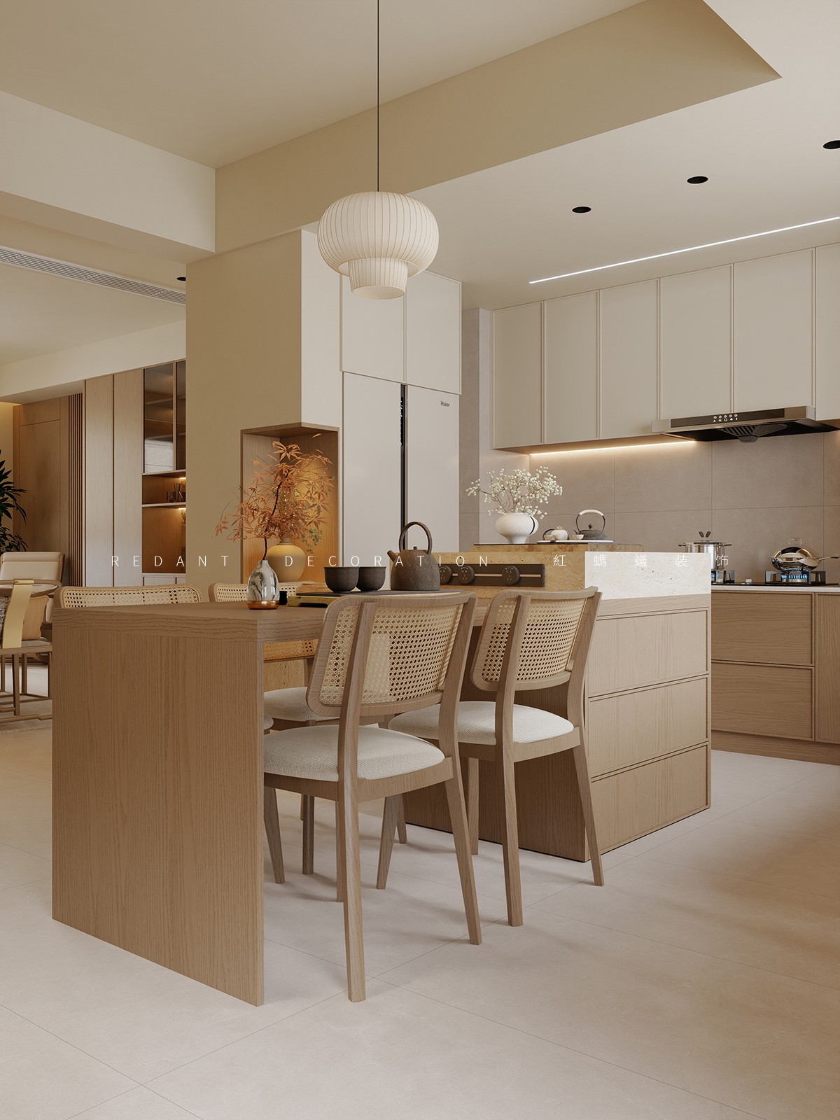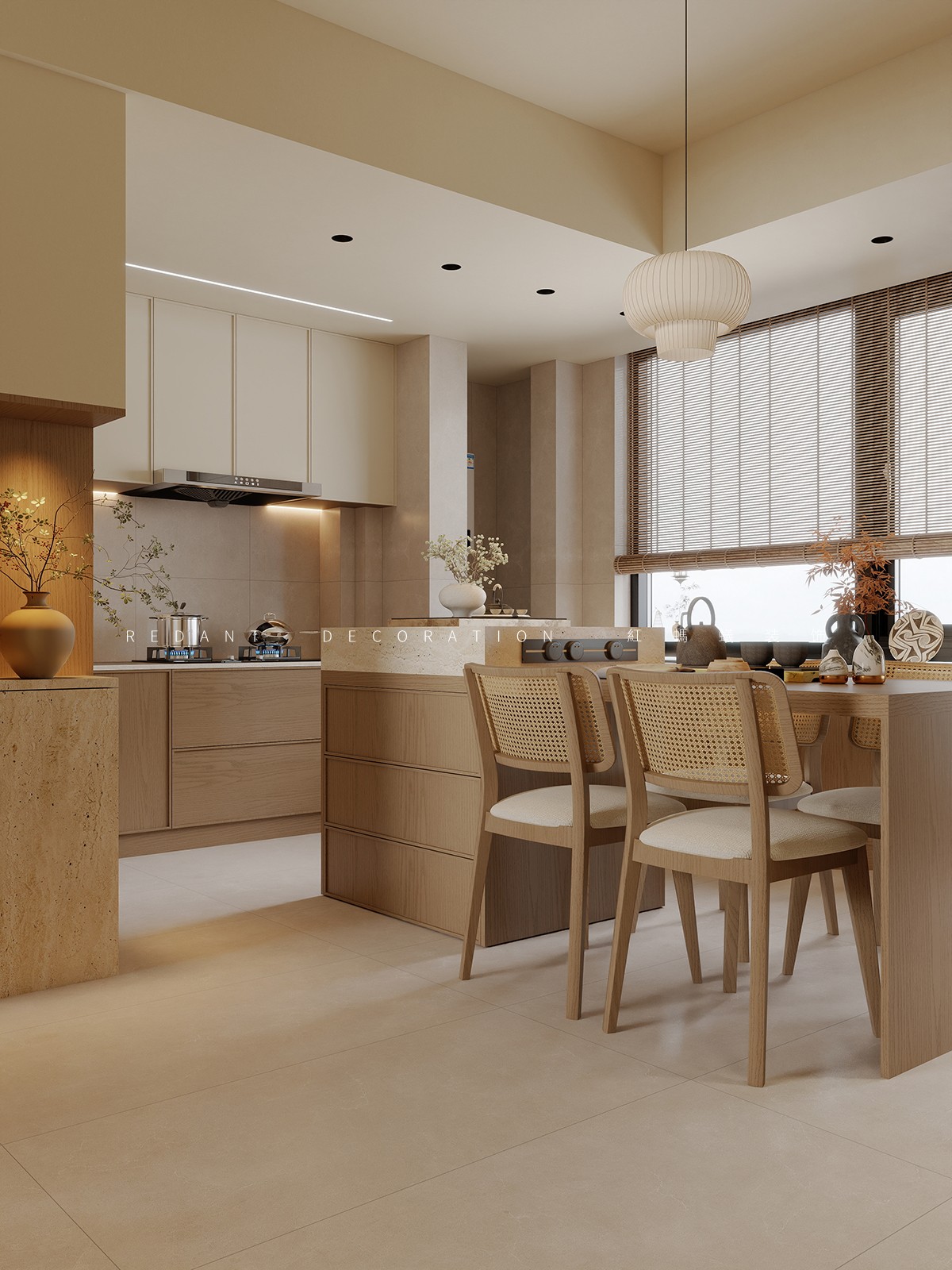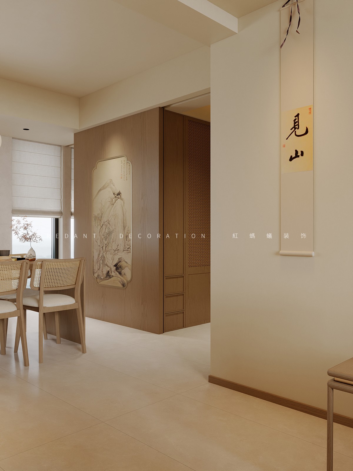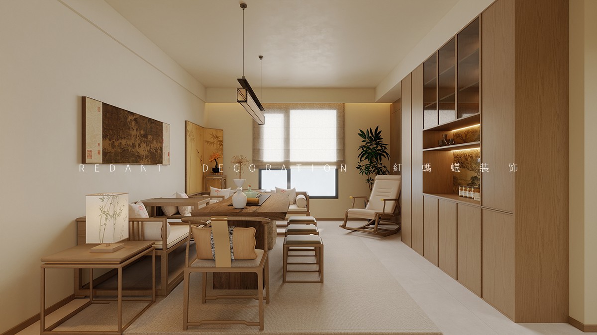 色彩以米白、暖木棕为基底,搭配浅灰麻质地毯,营造温润柔和的视觉基调;材质选用天然实木、棉麻软装与亚麻窗帘,弱化现代空间的冷硬感,传递自然质朴的东方质感。