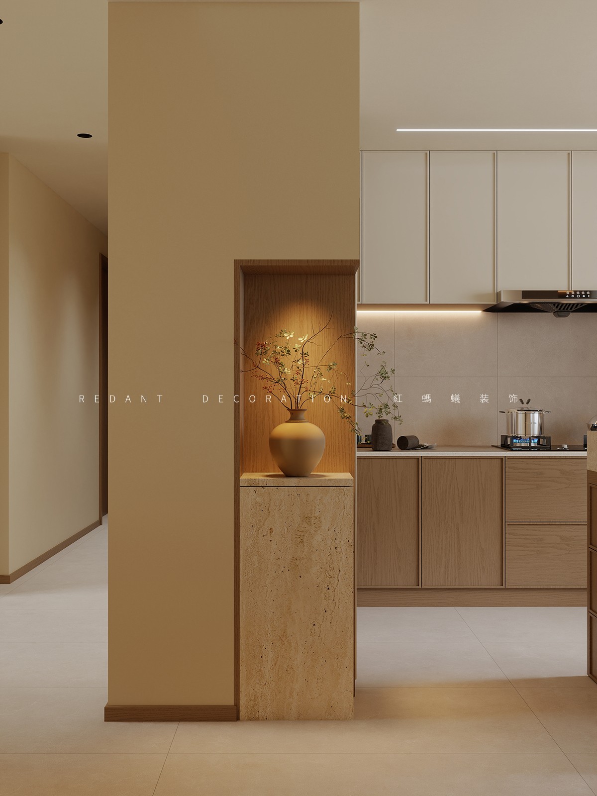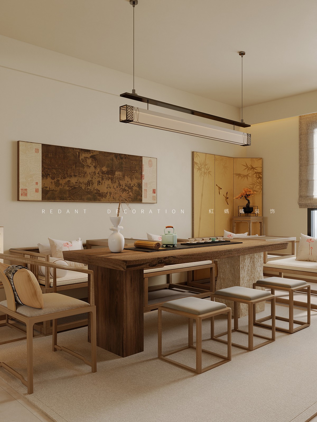 灯光采用分层设计:长条线性吊灯聚焦茶桌,提供核心照明;柜内灯带与墙面氛围灯勾勒层次,搭配自然光透过百叶帘的柔和渗透,结合古画、竹韵屏风与枯枝花艺点缀,营造静谧雅致的东方禅意氛围。
