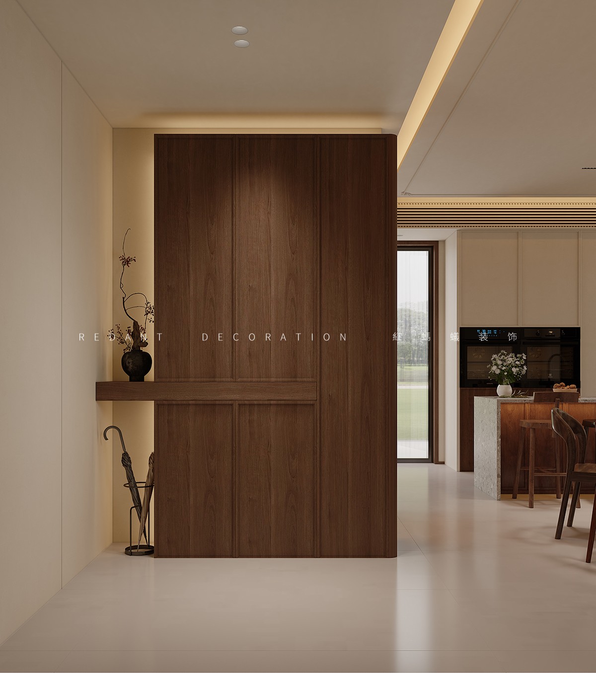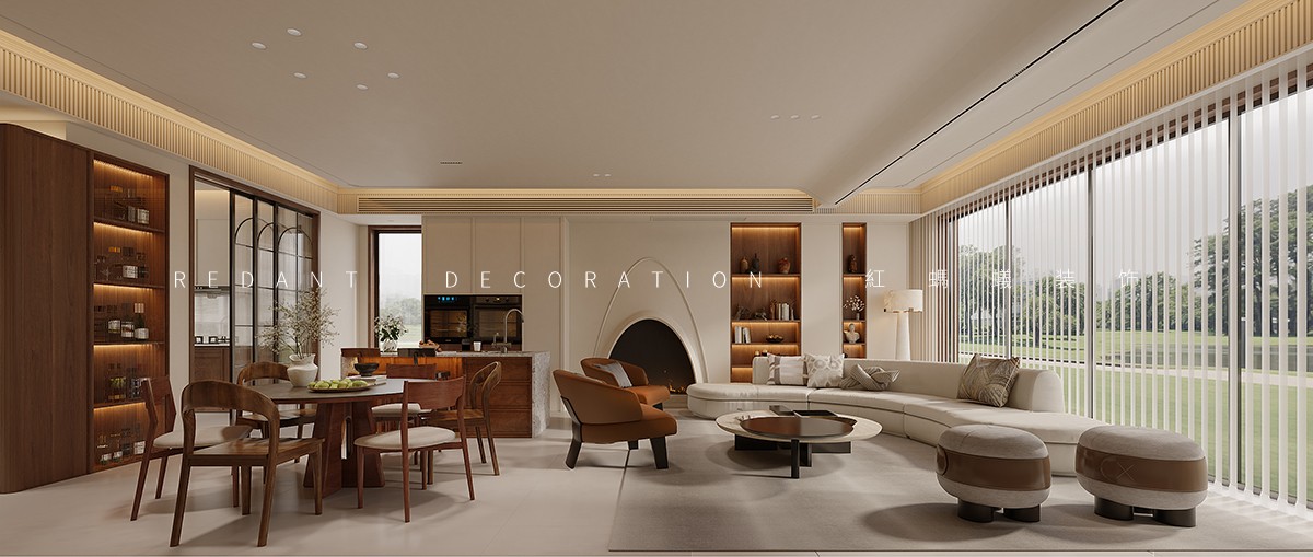 本设计以中古风为核心,结合叠墅尺度与当代实用性,打造复古又松弛的家庭核心社交区。以米白、浅咖搭胡桃木奠定雅致基调,用法式线条与木质饰面平衡厚重感。家具选弧形布艺沙发、胡桃木桌椅等,壁炉背景墙、嵌入式柜体兼具美观与收纳。落地窗引自然光融室外绿意,实现“复古而不陈旧,精致且具温度”的居住体验。