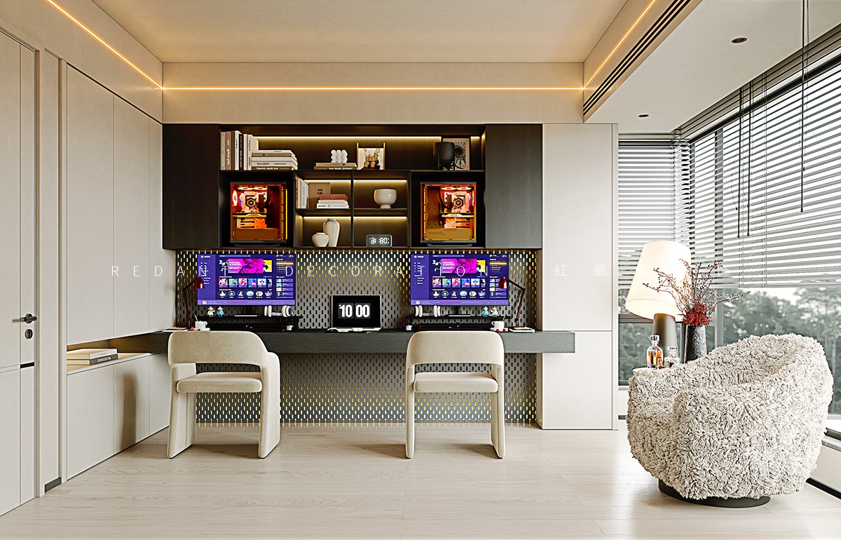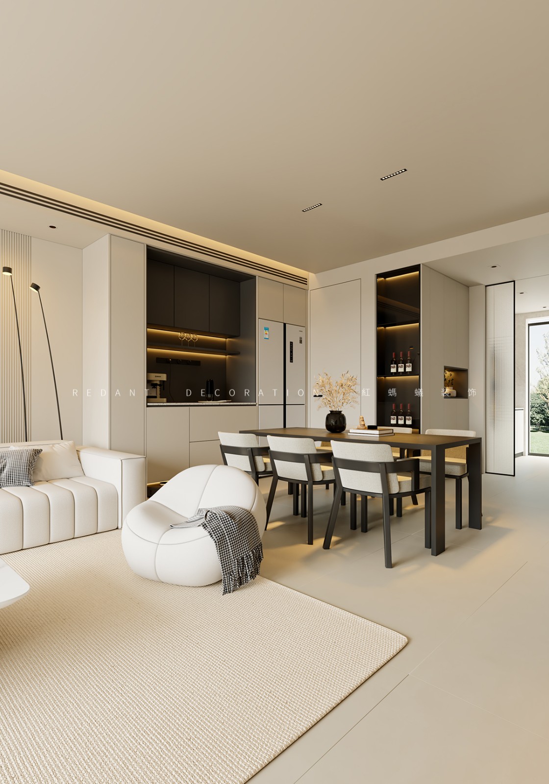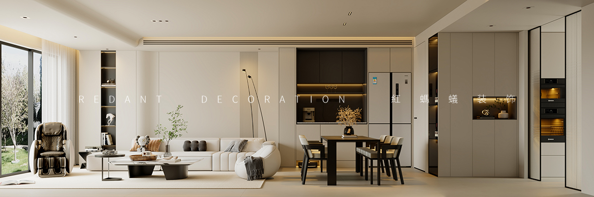 本项目以现代风格为核心,以米白、浅灰、深棕为主色调,暖金色灯光点缀,打造高级静谧的居住空间。客餐厅采用开放式一体化设计,借大面积落地窗引入自然光;卧室以材质色彩过渡营造私密休憩氛围。材质上运用哑光烤漆、微水泥等,局部点缀深色木饰面与金属线条。照明采用无主灯设计,公共区明亮开阔,卧室柔和温馨。通过定制收纳整合功能,以纯粹线条、材质与光影构建空间,打造简约舒适的理想居所。