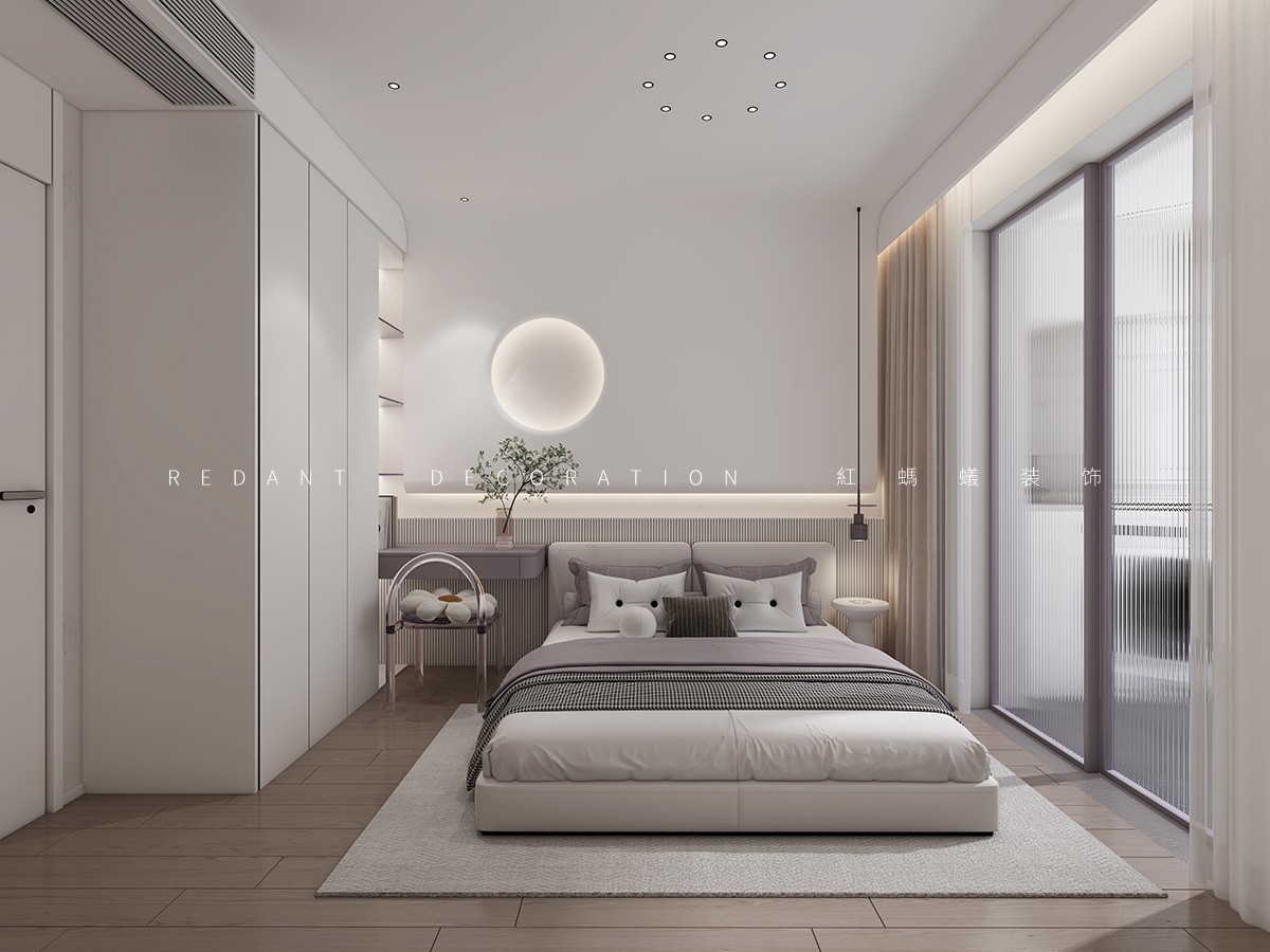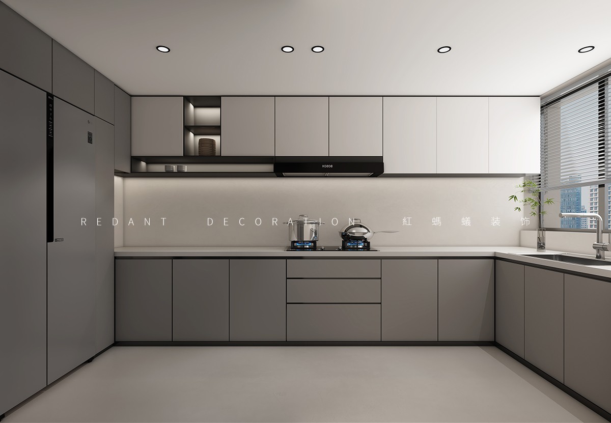 本方案以现代主义为核心,以浅米白、深炭灰的色彩对比,搭配微水泥、木饰面等材质,打造兼具秩序感与温度感的居住空间。餐厨区以深炭灰橱柜配白色台面,红色吊灯作焦点,长虹玻璃移门实现空间互动;客厅以浅米色沙发为核心,深绿大理石茶几、艺术挂画营造松弛高级氛围;卧室以一体化背景墙、通顶柜优化空间,浅灰床品、原木地板弱化冷感,全景窗引入城市景观。设计以动线、质感、功能为核心,融合秩序美学与松弛舒适,提升居住品质。