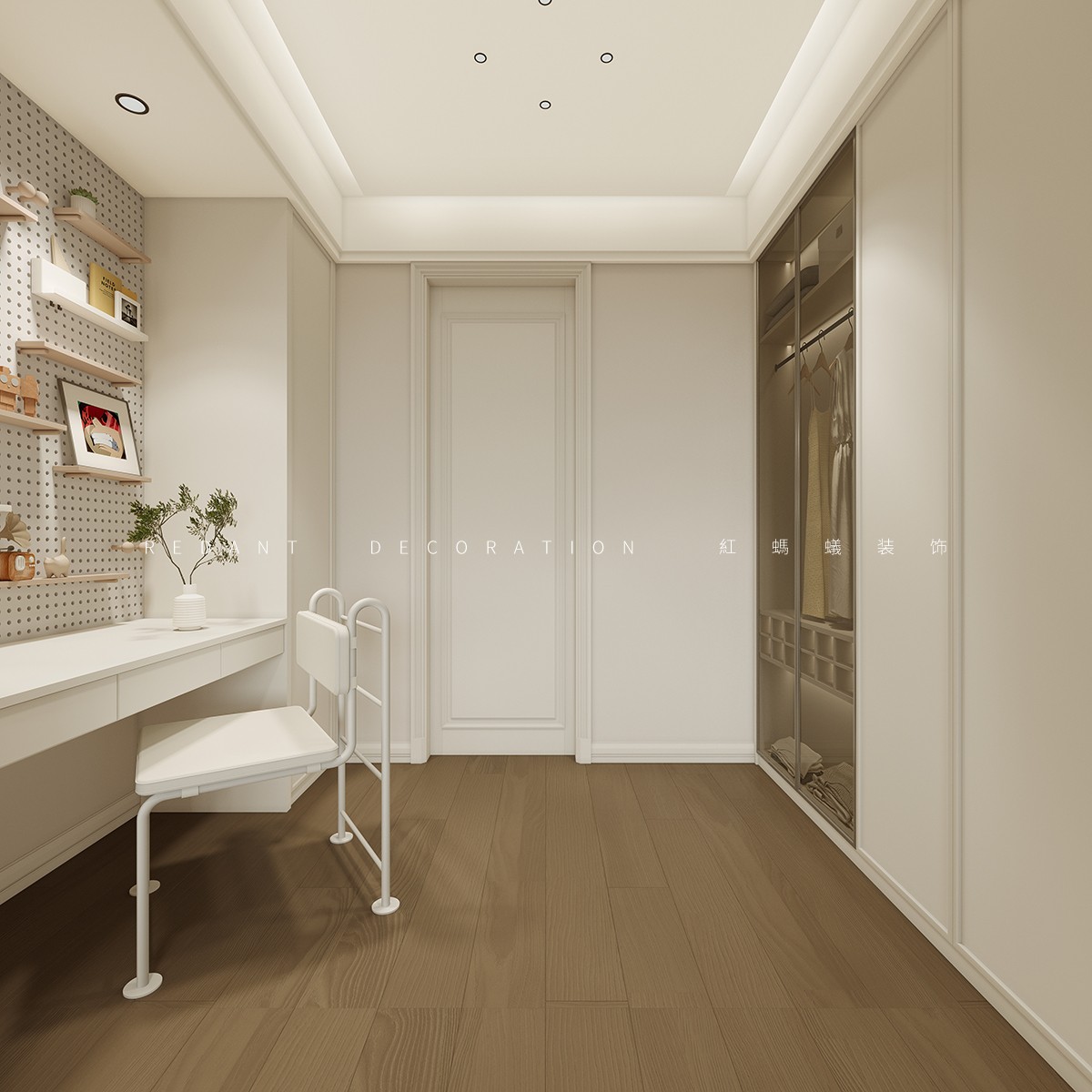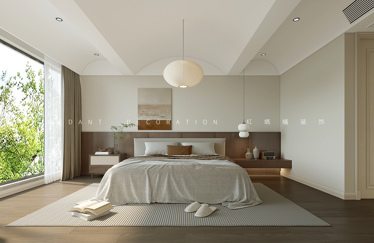 本方案以米白、奶咖色为基调,搭配原木材质与精致肌理,打造兼具浪漫仪式感与松弛治愈感的卧室空间。主卧一以石膏线吊顶、雕花软包床头复刻法式优雅,奶白花瓣吊灯与暖光壁灯柔化空间,通顶收纳柜与开放式书架兼顾实用与通透;主卧二弱化繁复线条,以弧形门洞、圆角柜体营造柔和边界,奶咖色墙面搭配艺术挂画,全景窗引绿意入室,原木地板与棉麻地毯增添温度。整套设计以色彩、材质与软装的精细化搭配,实现颜值与实用性的双重平衡。