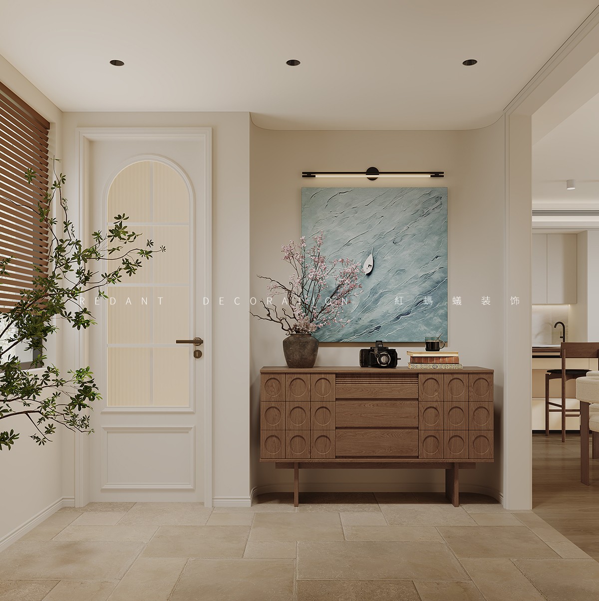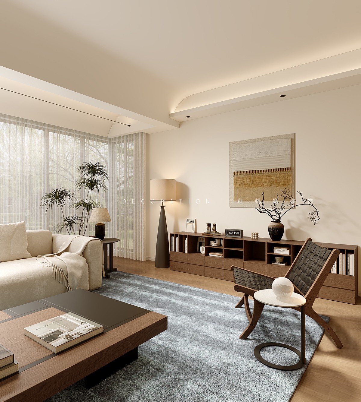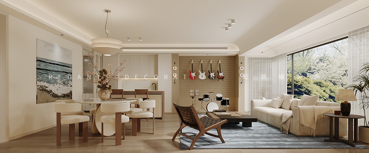 本方案以暖白、浅橡木色为基底,搭配实木、棉麻与低饱和蓝调,打造宜居空间。客餐厨一体化布局,浅米沙发配实木茶几,蓝地毯成视觉亮点,洞洞板打造音乐角;玄关实木柜配蓝调挂画,拱门与百叶窗增层次;卧室浅橡木背景墙配通顶衣柜,悬浮飘窗书桌兼顾办公阅读。设计以原生材质、和谐色彩、人性化规划,融合自然治愈、个性表达与现代生活需求。