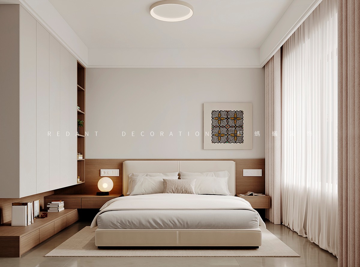 儿童房充分利用飘窗延展打造书桌,满足学习需求;床侧一体设计书柜与床头柜,衣柜按常规尺寸设置,确保收纳充足。生活阳台规划为家政区,定制洗衣机伴侣并增设储物高柜,顶部安装升降晾衣架,保持空间整洁有序。全案通过精细化布局,实现功能与美感的平衡,诠释现代简约生活的本质。