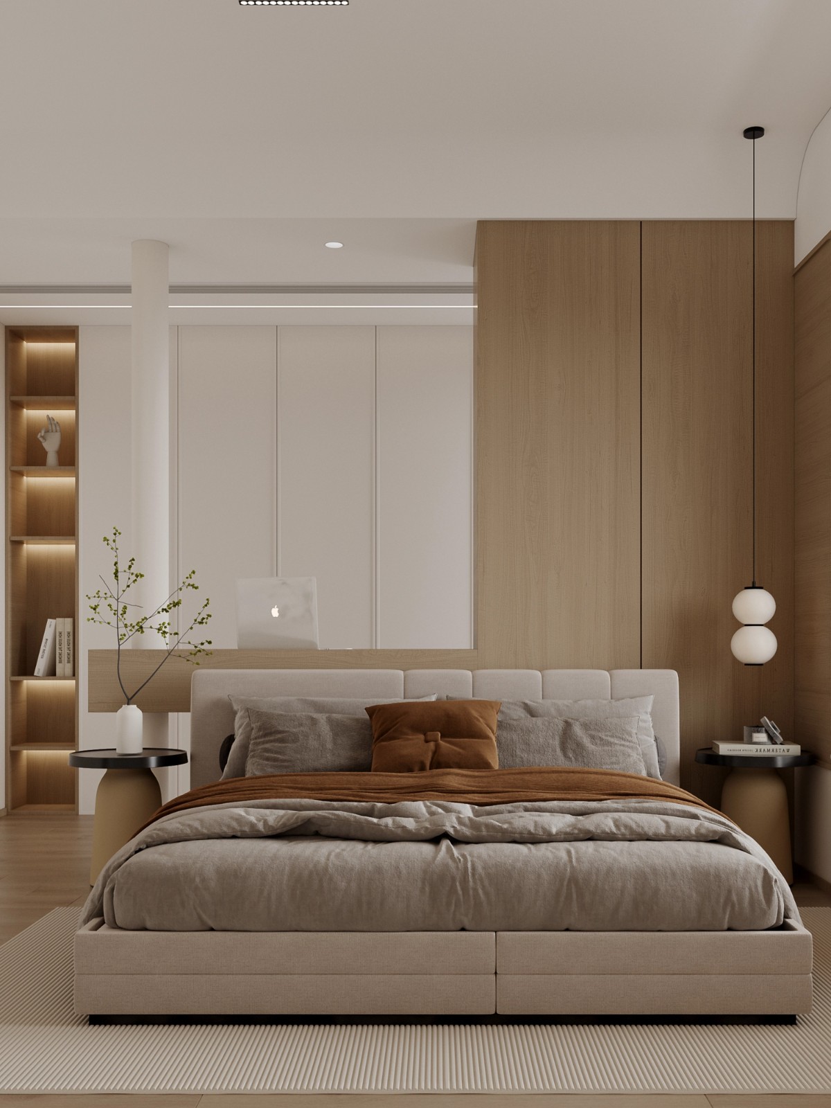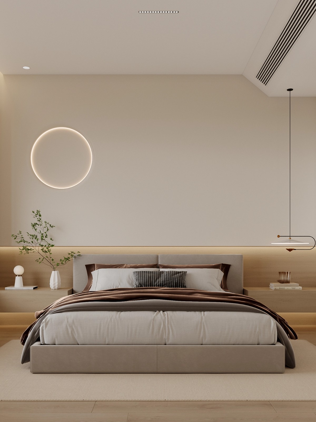 艺术感圆形灯光装置与简约床品结合,为卧室注入艺术气息,晨起暮归间,尽是被温柔包裹的治愈感。