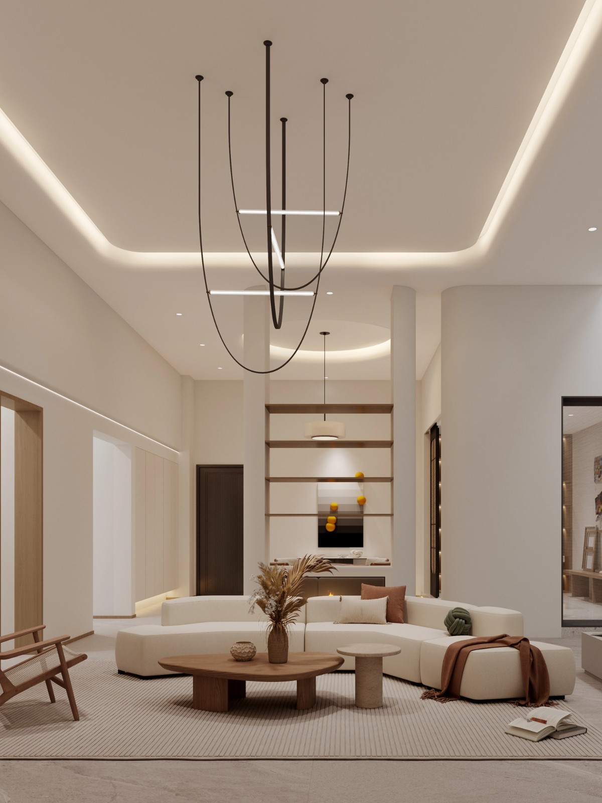 弧形奶油色沙发柔软治愈,搭配木质茶几与藤编单椅,自然元素的融入让空间满是松弛感,既是亲友相聚的社交场,也是独处放松的休憩地。