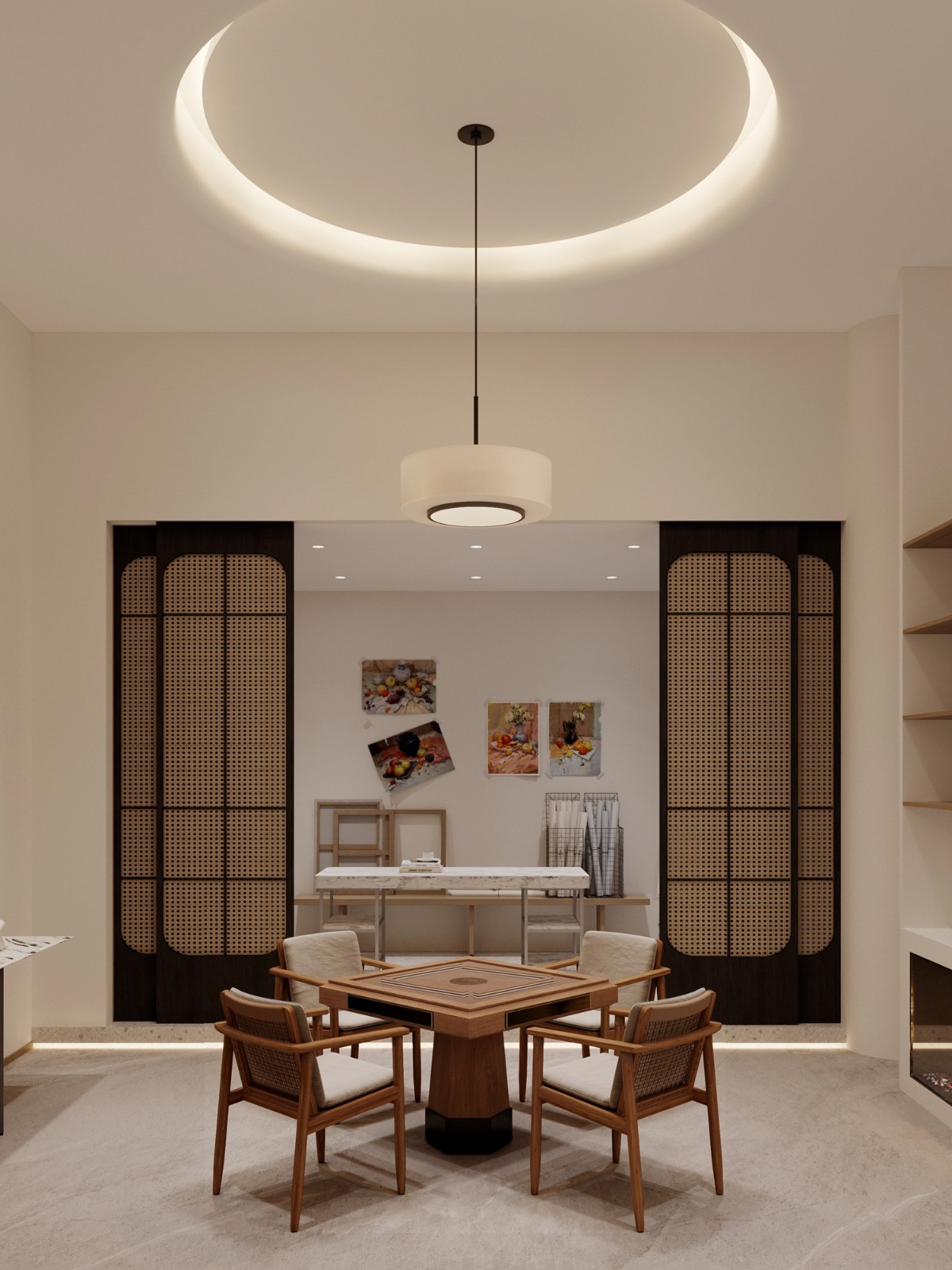 藤编屏风与圆形吊顶灯光营造出雅致氛围,将中式韵味与现代设计巧妙融合,打造出兼具功能性与美学价值的休闲空间,为生活增添一份雅致情趣。
