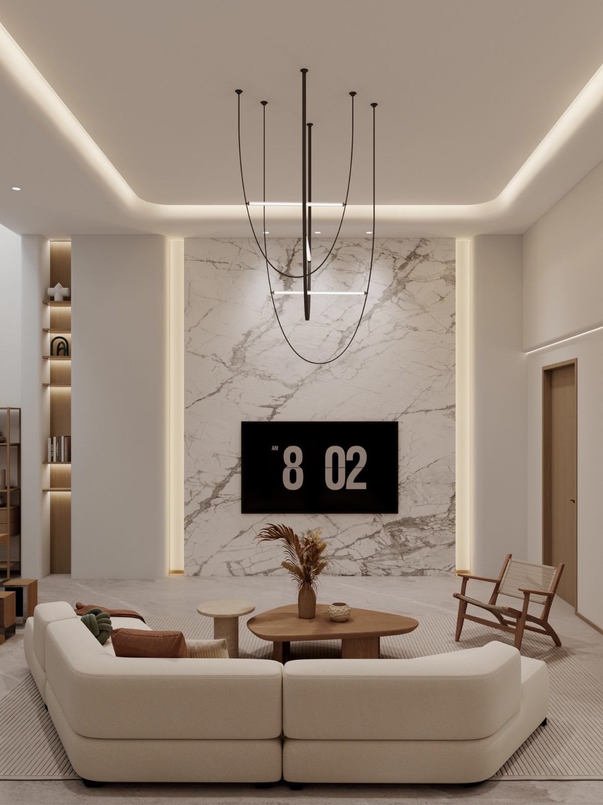 大理石背景墙纹理高级大气,极简时钟与艺术感吊灯相得益彰,极简设计勾勒出时尚格调,尽显屋主的品味与审美。