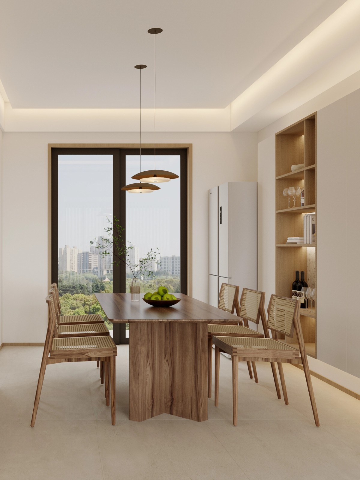 大窗设计将城市景观引入室内,木质餐桌搭配藤编餐椅,温馨与高级感并存。在此用餐,仿佛将风景与美食一同纳入生活,每一次进餐都是一场视觉与味觉的双重享受。